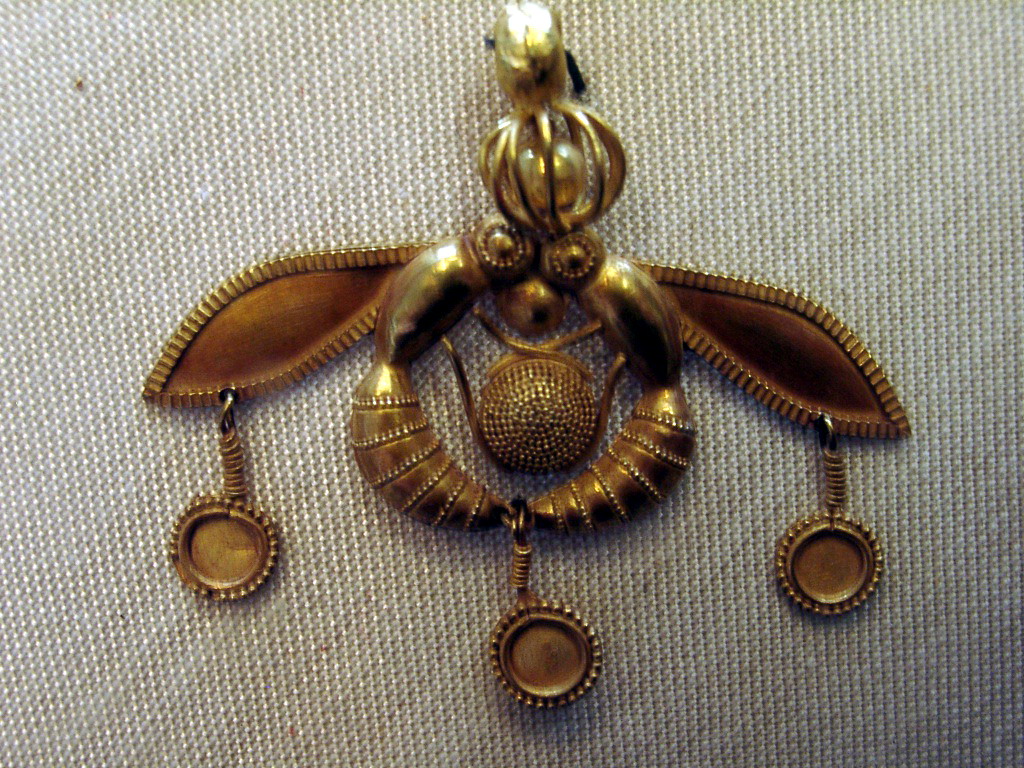 The beautiful bee pendant found at Malia, dated to the period 1800-1700 BC. Image source: Wikimedia Commons (author: probably Wikimedia Commons user Francois C, based on copyright claims, work released in the public domain)