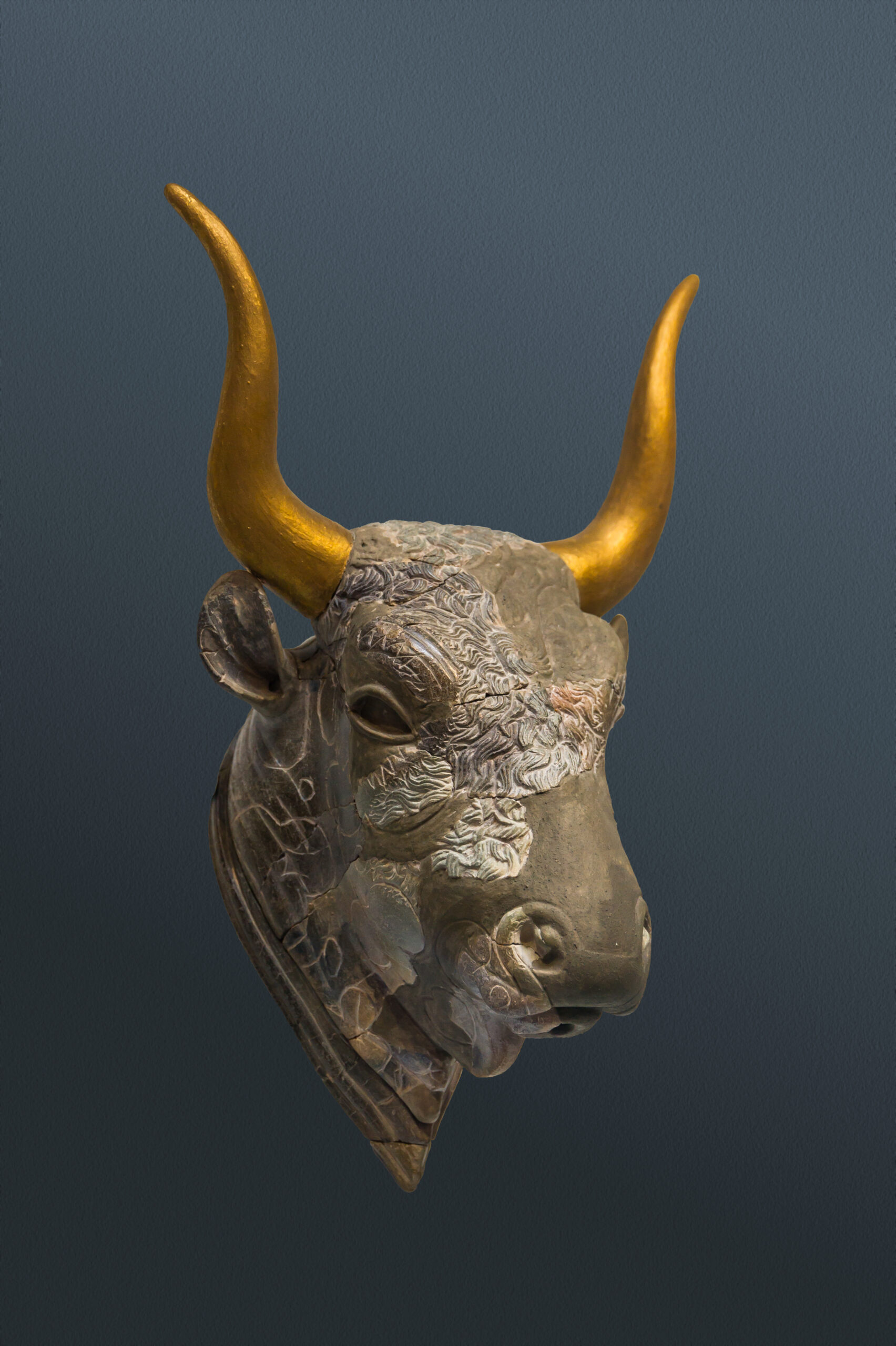 Bull head with golden horns from Zakros, now on display at the Heraklion Archaeological Museum. Image source: Wikimedia Commons (author: Wikimedia Commons user Jebulon, under CC0 licence, therefore available in the public domain)