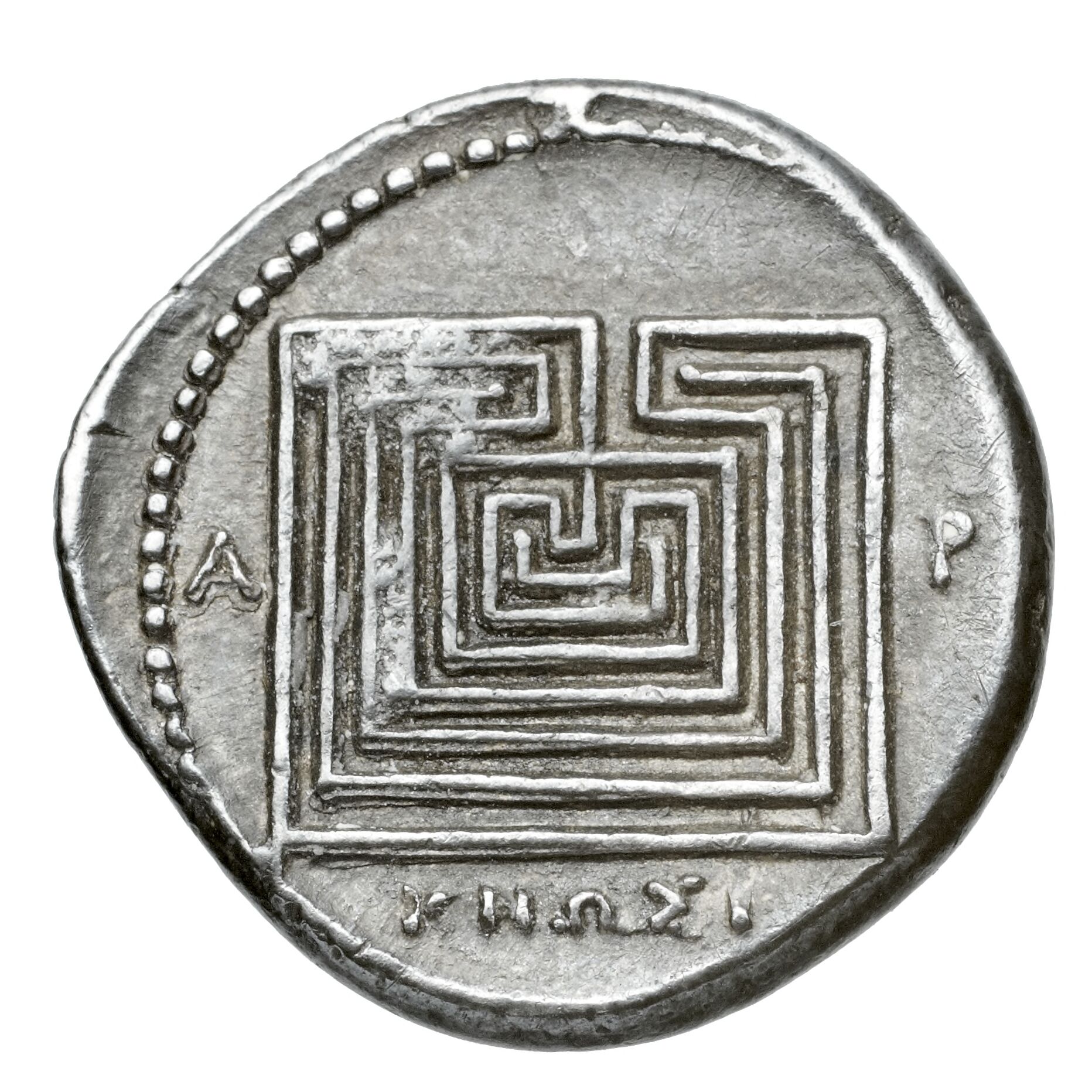 A coin found in Knossos depicting a labyrinth. The Palace of Knossos is associated with the myth of minotaur and the Athenian hero Theseus (part of the collection of Bibliothèque nationale de France). Image source: Wikimedia Commons