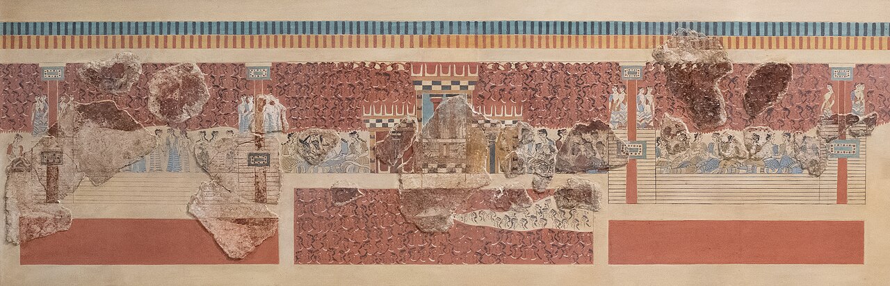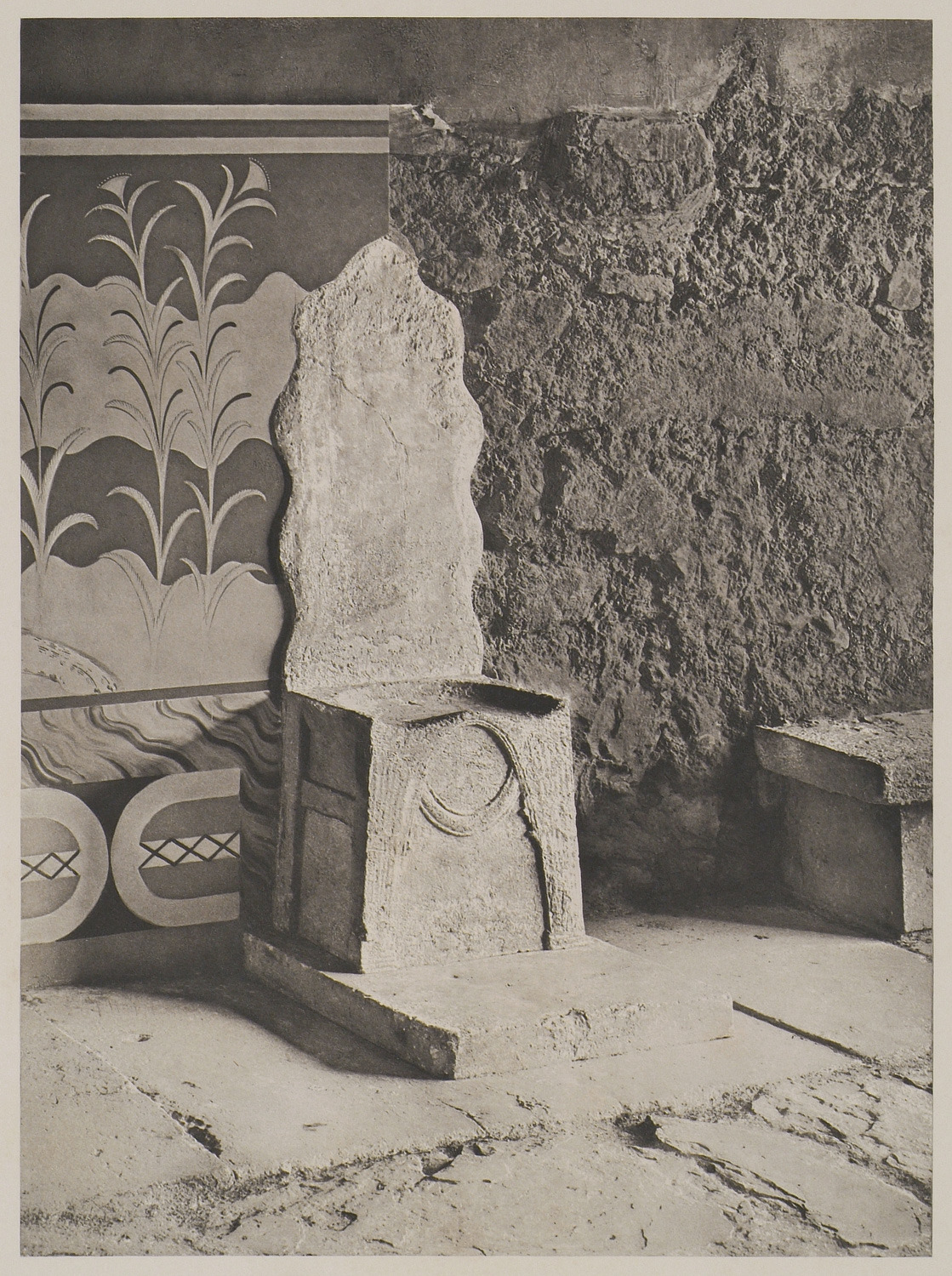 The Throne Room of the ancient Minoan Palace of Knossos with what is often considered the oldest throne in Europe. Image source: Wikimedia Commons (author: Frederic Boissonnas)