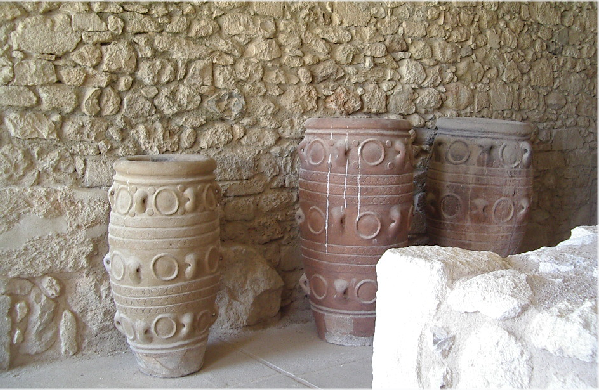 Storing jars discovered in Knossos, Heraklion, Crete, Greece. These jars are known as pithoi (singular form pithos). Image source: Wikimedia Commons