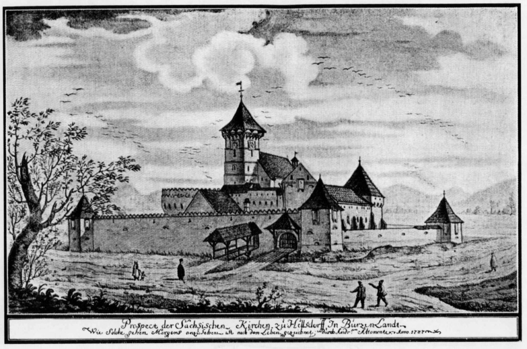 An early 18th century engraving of the Hălchiu/Heldsdorf Transylvanian Saxon medieval fortified church (dating to circa 1727 namely) with its defensive walls surrounding it. The author of this work is Andreas Altomonte. Image source: Wikimedia Commons